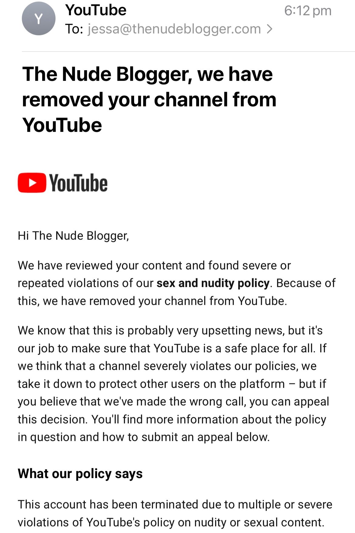 The reality of being a naturist content creator: the termination of my YouTube channel - part 2.